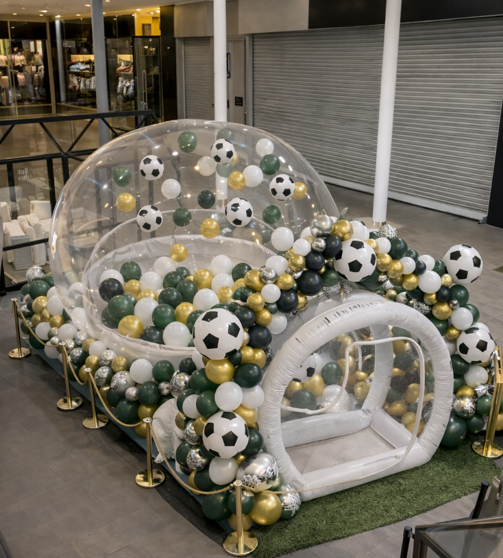 Cette animation propose une expérience insolite au cœur d’une grande bulle gonflable remplie de ballons aux couleurs du football.